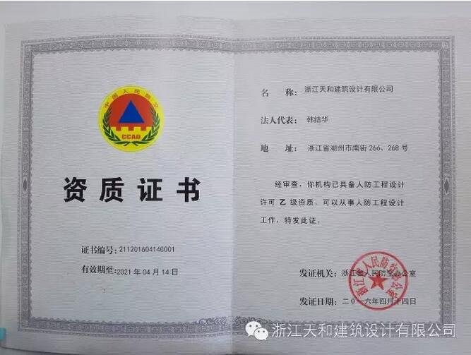 熱烈祝賀天和設(shè)計(jì)獲得浙江省人民防空辦公室頒發(fā)的人防工程設(shè)計(jì)乙級(jí)資質(zhì),為浙江省內(nèi)首批,湖州市獨(dú)家!自此,我公司可承接浙江省范圍內(nèi)建筑面積2萬平方米以下人防工程建設(shè)項(xiàng)目(不包含各類人防指揮所)主體工程、配套工程及地面附屬設(shè)備設(shè)施用房的設(shè)計(jì)業(yè)務(wù)。