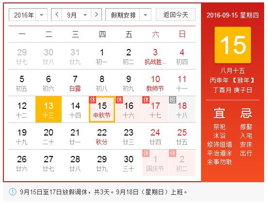 根據(jù)《國務(wù)院辦公廳關(guān)于2016年部分節(jié)假日安排的通知》精神,現(xiàn)將2016年中秋節(jié)放假日期安排通知如下: 9月15日(星期四)至9月17日(星期六)放假調(diào)休,共3天。9月18日(星期日)上班。